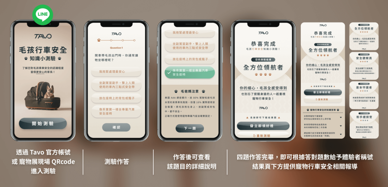 在 Tavo 參與的 2025 展昭寵物展期間,我們為品牌設計了一款名為「毛孩行車安全知識小測驗」的 LINE Liff 體驗,藉由測驗傳遞寵物乘車安全的重要觀念。測驗共四題,內容圍繞寵物若未使用安全座椅所可能面臨的風險,並於作答完畢後顯示飼主性格分類及推薦閱讀文章,引導受眾了解更多相關資訊。